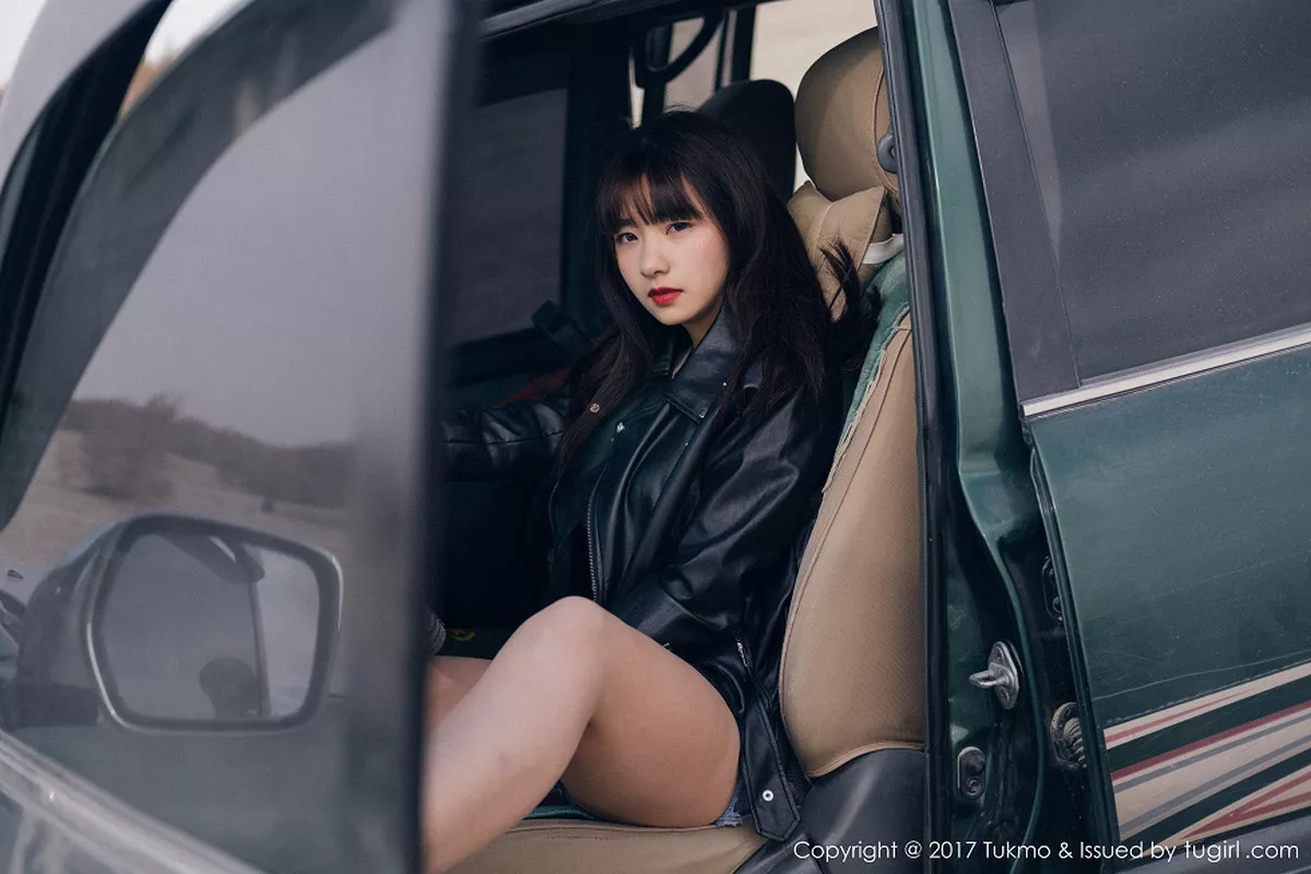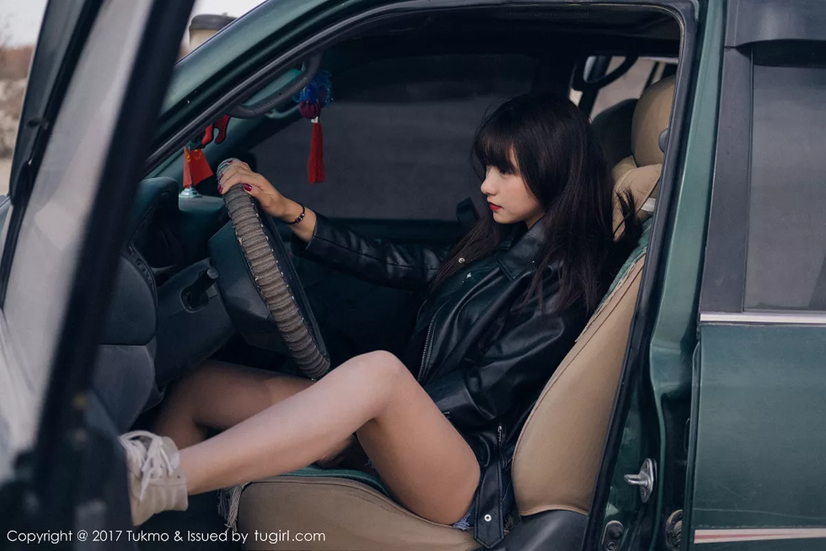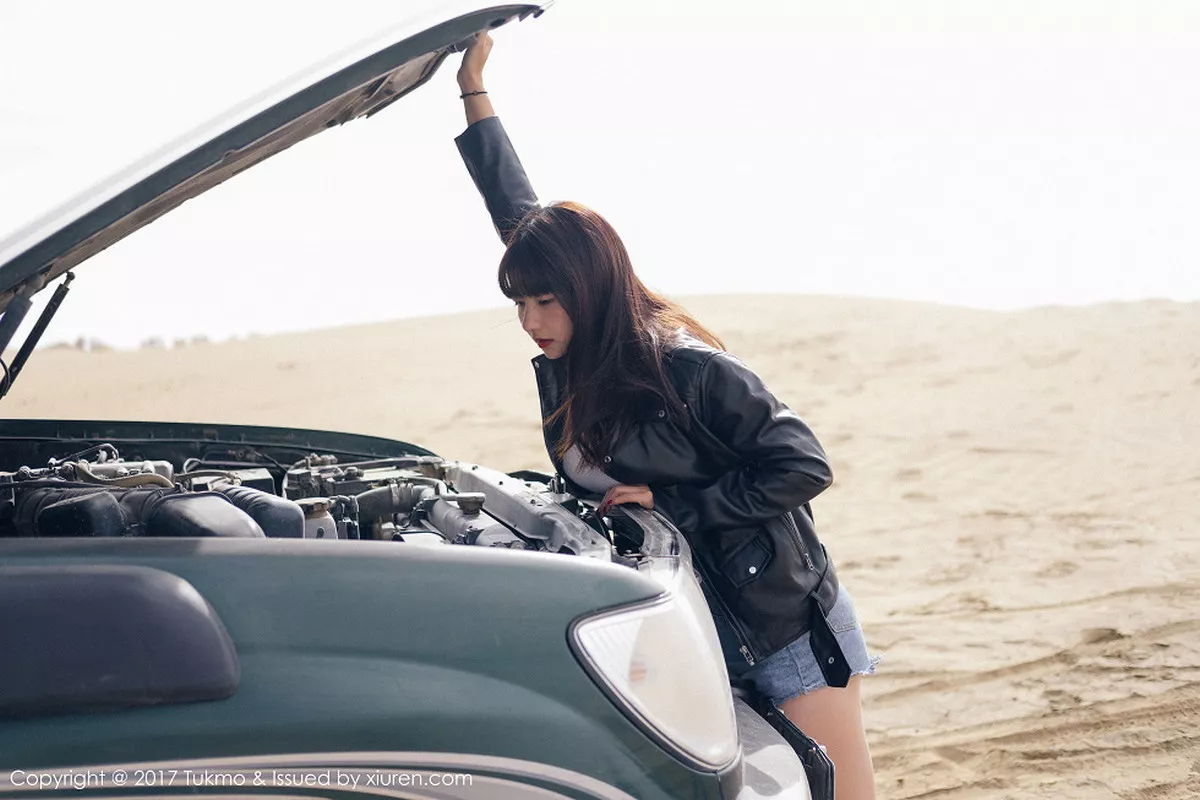 [Tukmo兔几盟] 2017.08.23 VOL.100 球球 模特@球球外景车拍写真发布,沙漠吉普车拍系列,黑皮衣加牛仔短裤下英气照人,回眸间温柔迷人,全套写真共52P,希望大家喜欢。。国内实体写真偶像[Tukmo兔几盟]第100期球球牛仔短裤清新迷人写真。