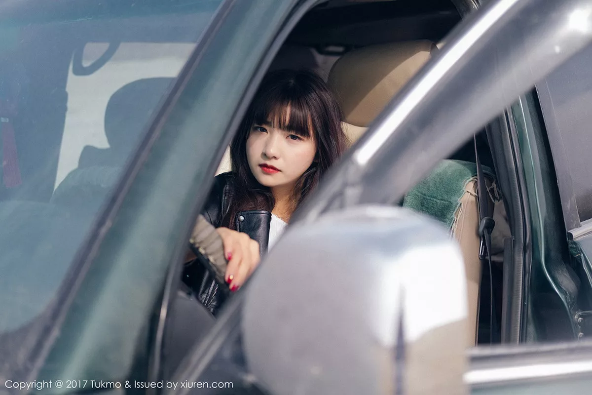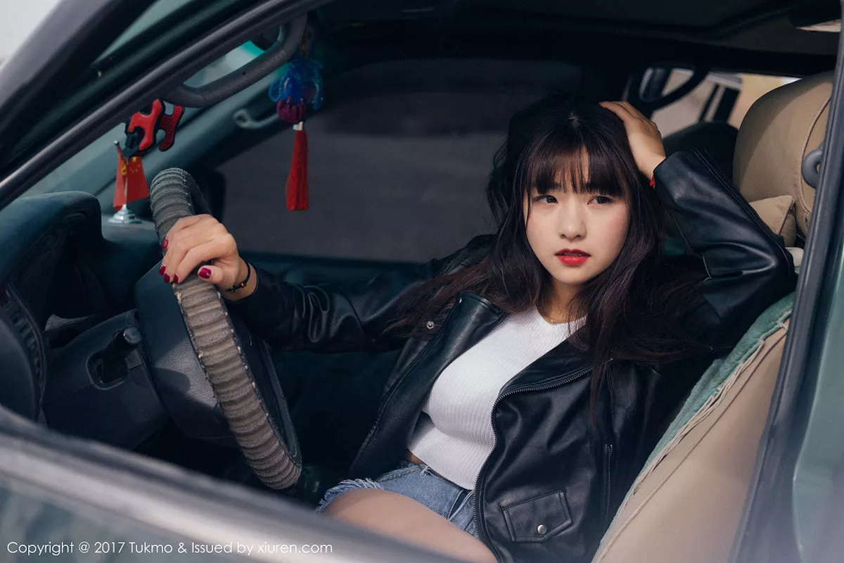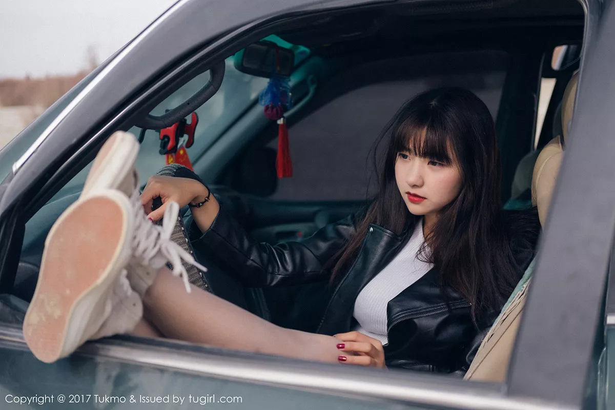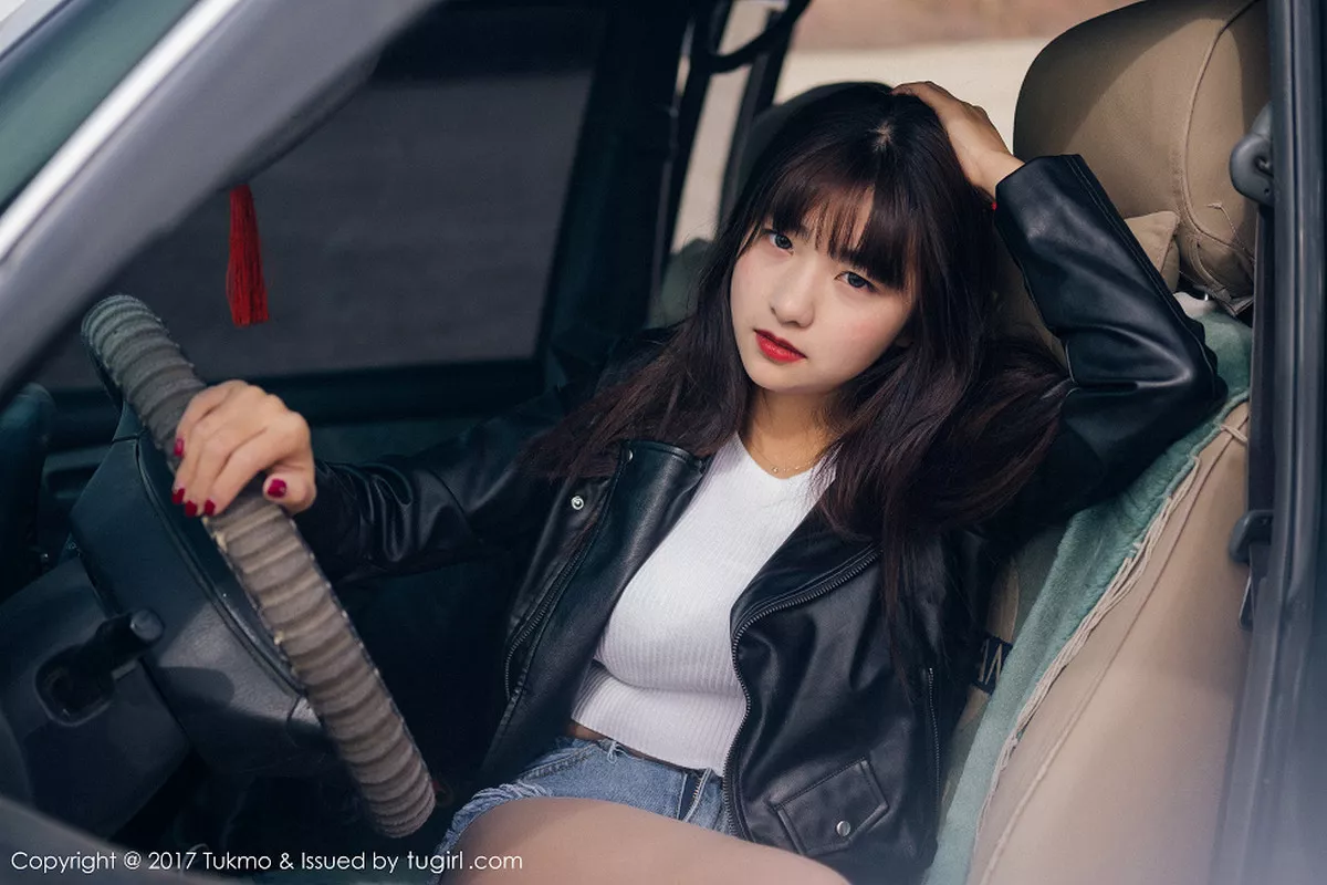 [Tukmo兔几盟] 2017.08.23 VOL.100 球球 模特@球球外景车拍写真发布,沙漠吉普车拍系列,黑皮衣加牛仔短裤下英气照人,回眸间温柔迷人,全套写真共52P,希望大家喜欢。。国内实体写真偶像[Tukmo兔几盟]第100期球球牛仔短裤清新迷人写真。