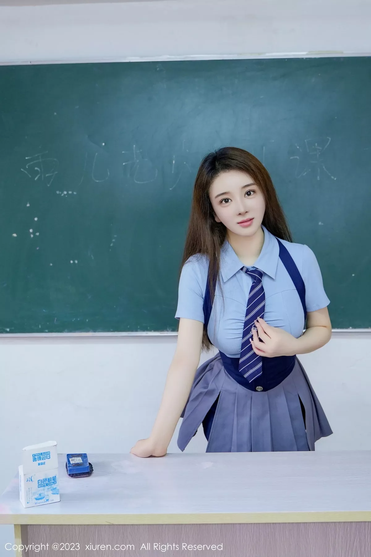 新人@eve雨儿1494 性感写真发布,性感蓝色上衣搭配灰色短裙,性感浅色内衣,教室场景拍摄,丰腴身材摄人心魄,长相清纯甜美身姿苗条动人的美女,全套写真共66P足量放送,希望大家喜欢和多多支持新人。摄影:打豆豆_。。。国内写真套图[XiuRen秀人网]第7064期雨儿浅色内衣完美诱惑写真。 <br> <br> 在初夏的晨光中,eve雨儿1494带着满身朝露走进摄影棚。她今天要完成三组风格迥异的写真拍摄,首套服装选择了棉质蕾丝边连衣裙,裙摆的镂空花纹在灯光下投下细碎阴影。化妆师特意为她设计了清透裸妆,用橘粉色腮红轻扫颧骨,眼妆部分采用棕色系渐变晕染,内眼线微微上挑勾勒出杏眼的轮廓。造型师将她的长发烫出自然弧度,发尾点缀着手工编织的雏菊发饰。